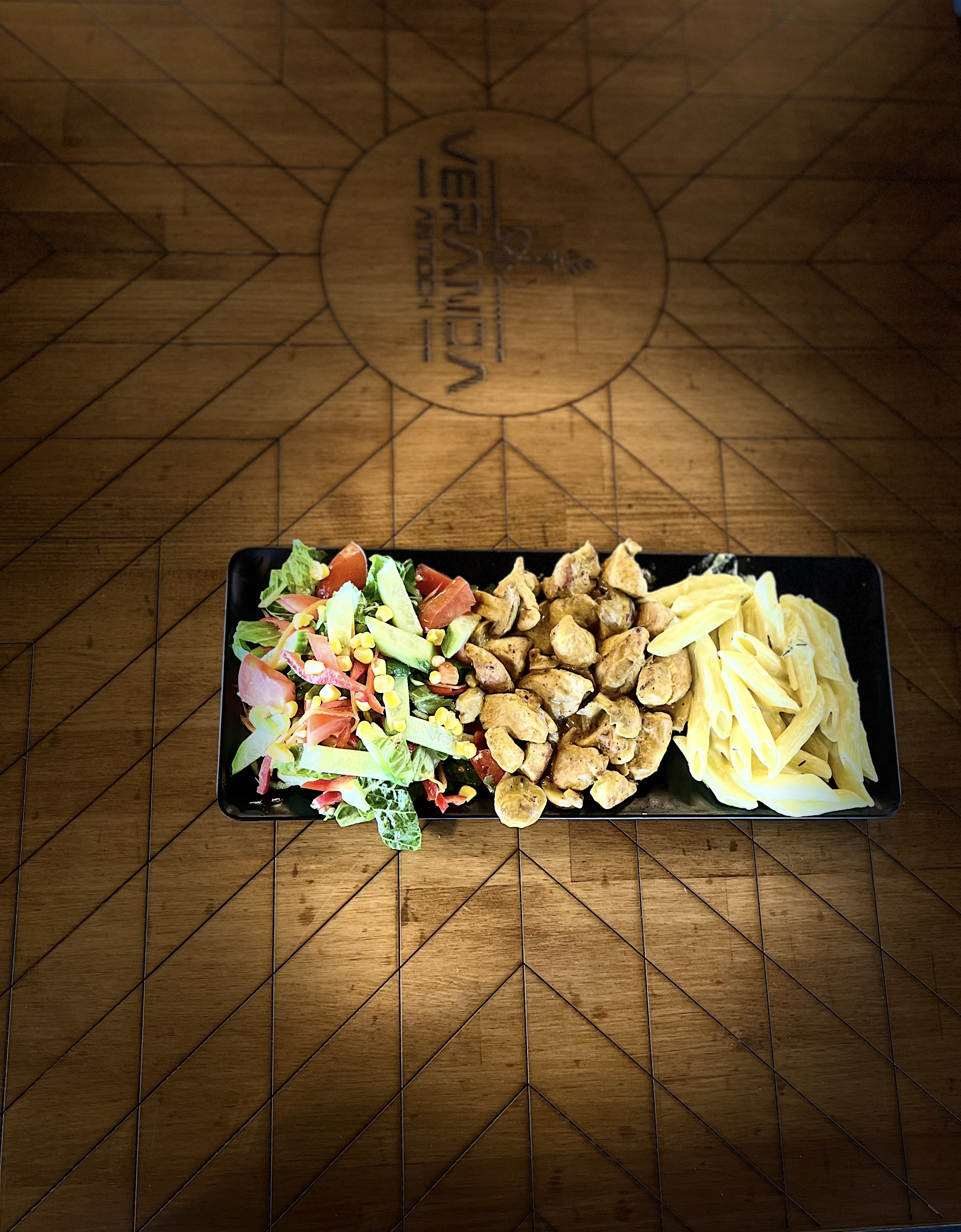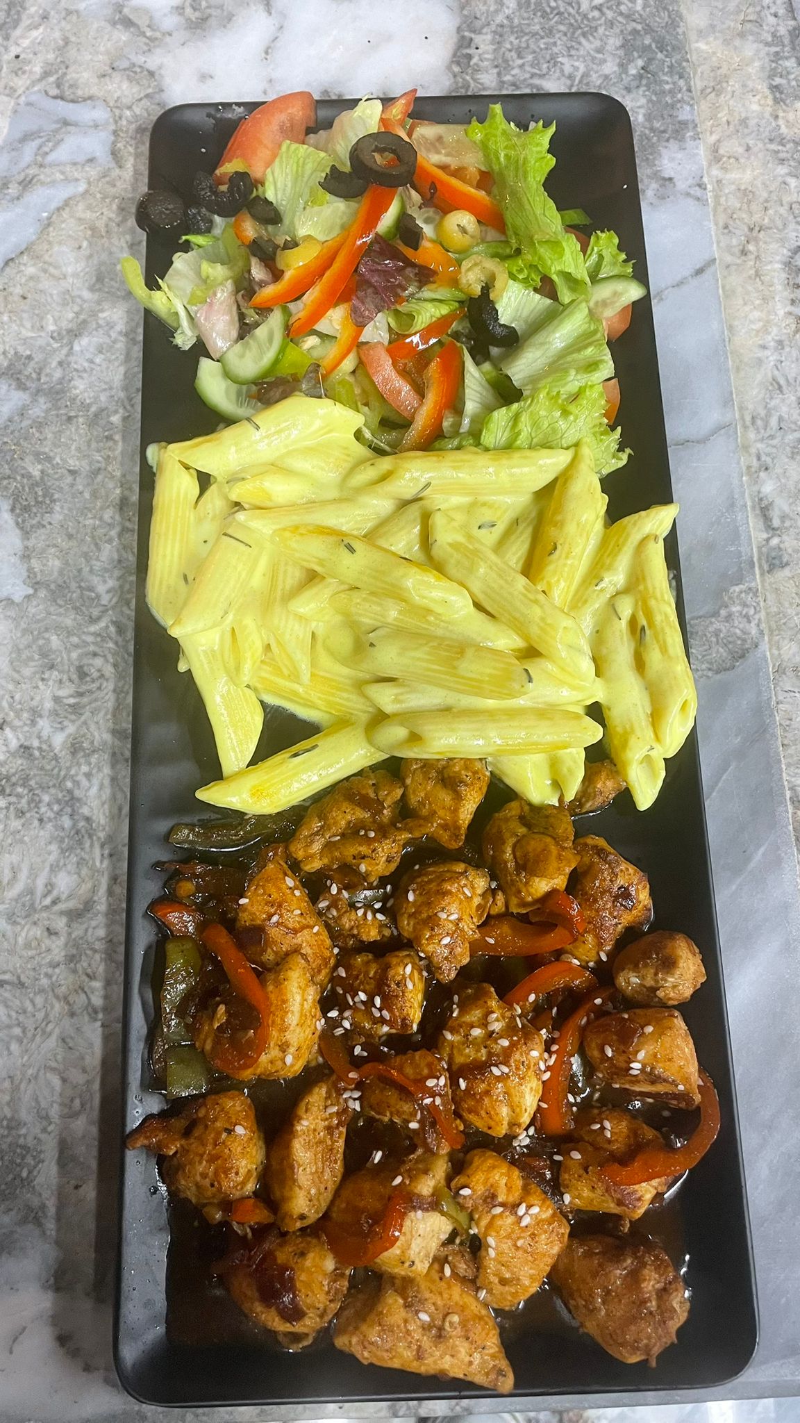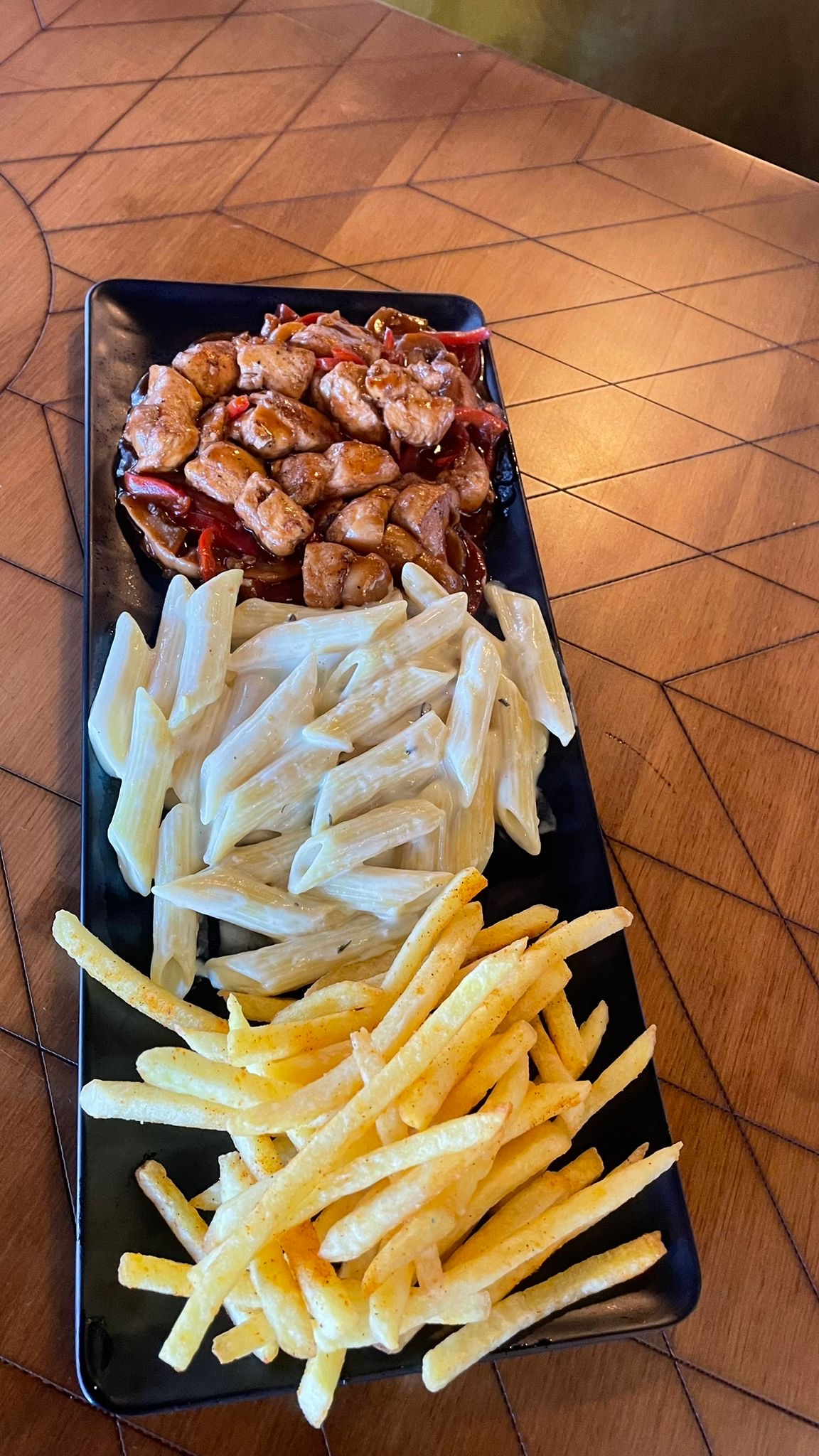Tavuk bonfile(200gr),capia biber,mantar,mısır,krema,sweetchili sos,makarna,yeşil biber,patates