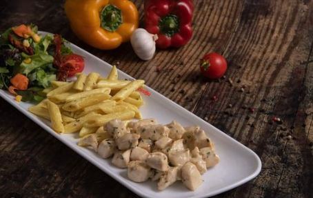 Tavuk bonfile (200gr)mantar,krema,yeşil biber,mısır,makarna, patates