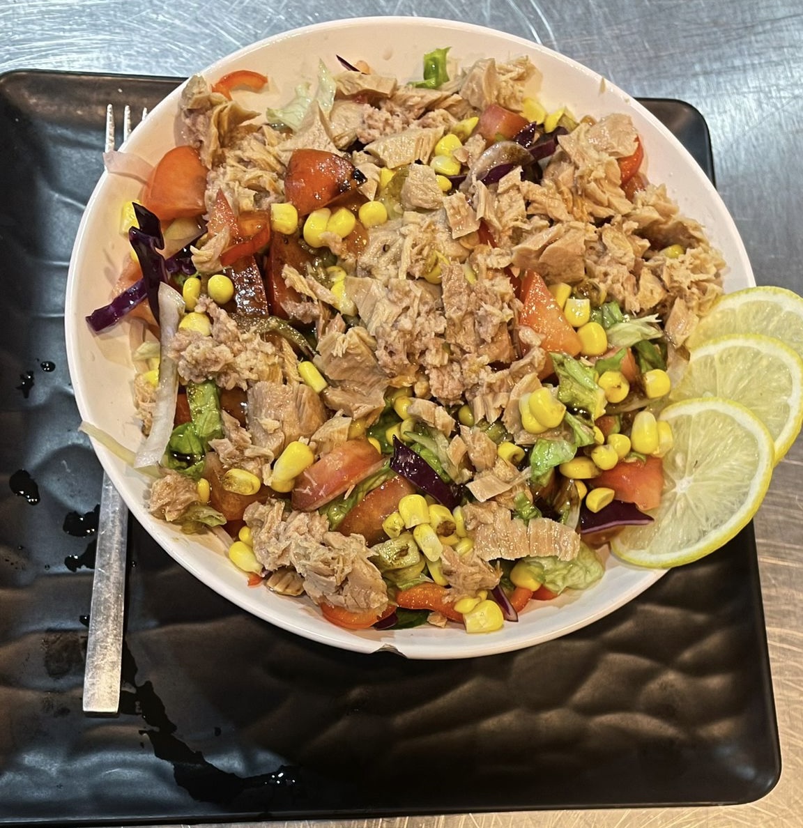 Ton balık,soğan,mısır,biber,domates,marul,salatalık,